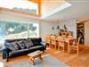Parterre: Flur mit Garderobe, Schuhregal. Sehr schöner, heller, teils bis zum Dachgiebel ausgebauter Wohnraum (27 qm) mit großen Panoramafenstern, gemütlicher Sofa-Sitzecke am Kamin, TV, Esstisch. Moderne Küche mit Backofen, Spülmaschine. Zwei Doppelzimmer. Kleines Doppelzimmer mit franz. Bett. Bad: Bw/Du, Wb, WC.