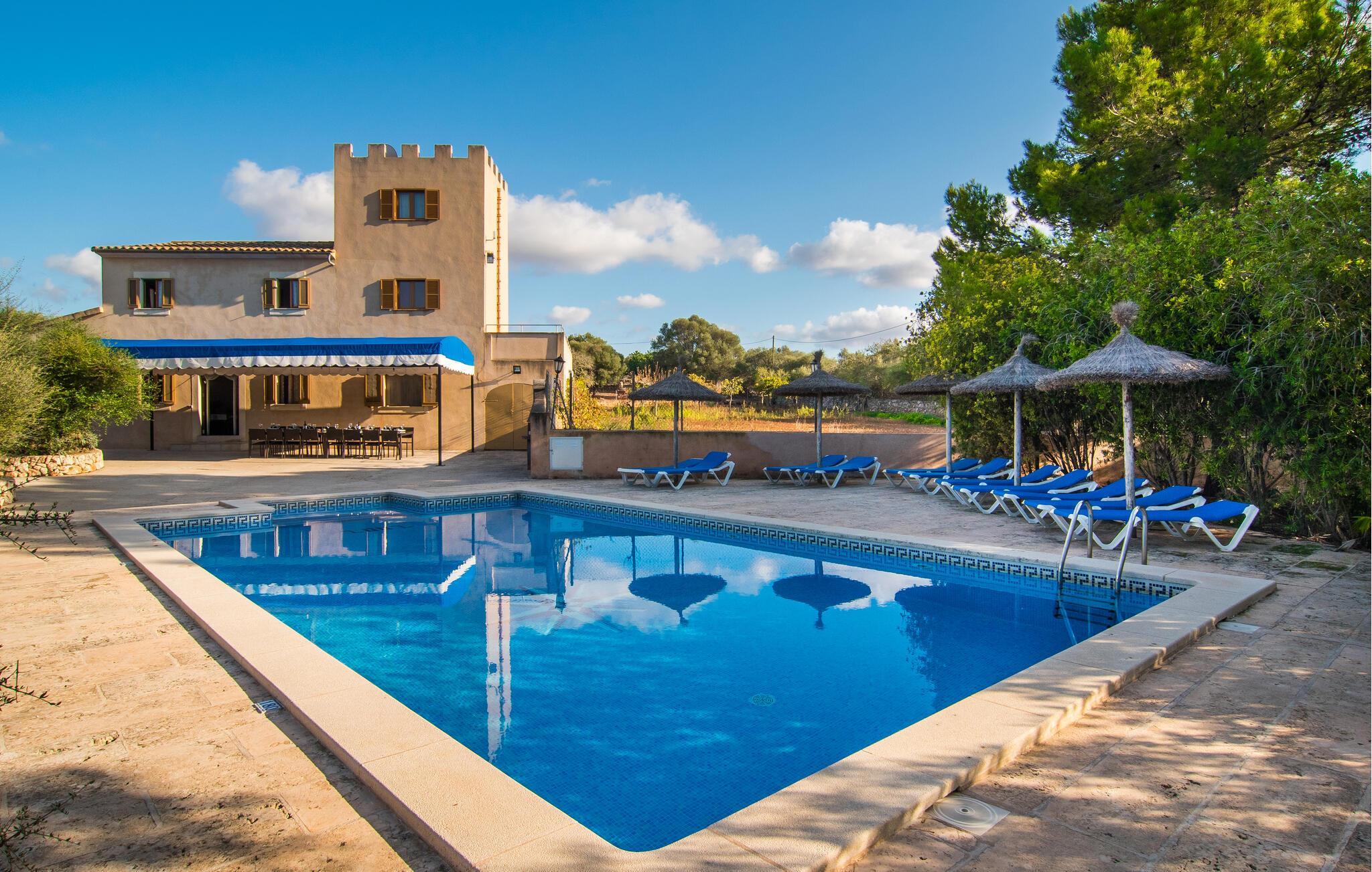 Genießen Sie entspannte Tage in dieser traditionellen Finca mit großem Pool und mediterranem Flair. Erleben Sie einen erholsamen Urlaub in diesem großzügigen Ferienhaus im Süden von Mallorca. Umgeben von weiten Feldern und mediterraner Natur, genießen Sie