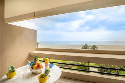 4,02-Zimmer-Wohnung 40 m2 im 6. Stock. Komfortabel eingerichtet: Wohn-/Esszimmer mit 1 Doppeldiwanbett (1 x 140 cm, Länge 190 cm), TV, Flachbildschirm und Klimaanlage. Ausgang zur Terrasse, Richtung Süden und Richtung Osten. 1 Zimmer mit 1 franz. Bett (1 x 140