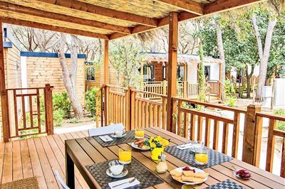 4,3"Deluxe", 3-Zimmer-Mobilheim 45 m2, im erhöhten Erdgeschoss. Modern und geschmackvoll eingerichtet: Wohn-/Schlafzimmer mit 1 Schlafmöglichkeit (80 cm), Esstisch, TV und Klimaanlage. Ausgang zur Terrasse. 1 Zimmer mit 1 franz. Bett (170 cm). 1 Zimmer mit 2