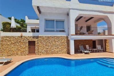 4,3"Brisas del Mar", 4-Zimmer-Villa 150 m2. Sehr schön und gemütlich eingerichtet: Wohn-/Esszimmer mit Schiebetür mit Sat-TV, Klimaanlage und Warmluftheizung. Ausgang zum Garten, zur Terrasse. 1 Zimmer mit 1 franz. Bett (160 cm, Länge 200 cm), Dusche/WC,