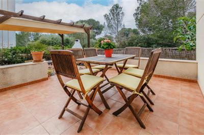 4,0"Villa Platja Calafato", 4-Zimmer-Villa 180 m2. Sehr komfortabel und geschmackvoll eingerichtet: Wohn-/Esszimmer mit Digital-TV und Klimaanlage. Ausgang zur Terrasse. 1 Zimmer mit 1 franz. Bett (135 cm). 1 Zimmer mit 1 x 2 Etagenbetten (90 cm). 1 Zimmer mit 2