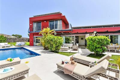 3,0"Sunset 10PAX", 6-Zimmer-Haus 480 m2 auf 2 Stockwerken. Modern und luxuriös eingerichtet: Wohn-/Esszimmer mit Esstisch, Kabel-TV, Digital-TV und Klimaanlage. Ausgang zum Gartensitzplatz. 3 Zimmer, jedes Zimmer mit 1 franz. Bett, Dusche/WC und Klimaanlage. 2