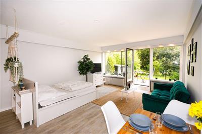 App. Zeitlos im Panoramic, klein aber fein mit Terrasse, Garten und strandnah Das Appartement "Zeitlos" im Panoramic in Sierksdorf bietet auf 37 m² Platz für bis zu vier Personen und liegt nur 350 Meter vom Sandstrand entfernt. Mit offener Küche, gemütlichem