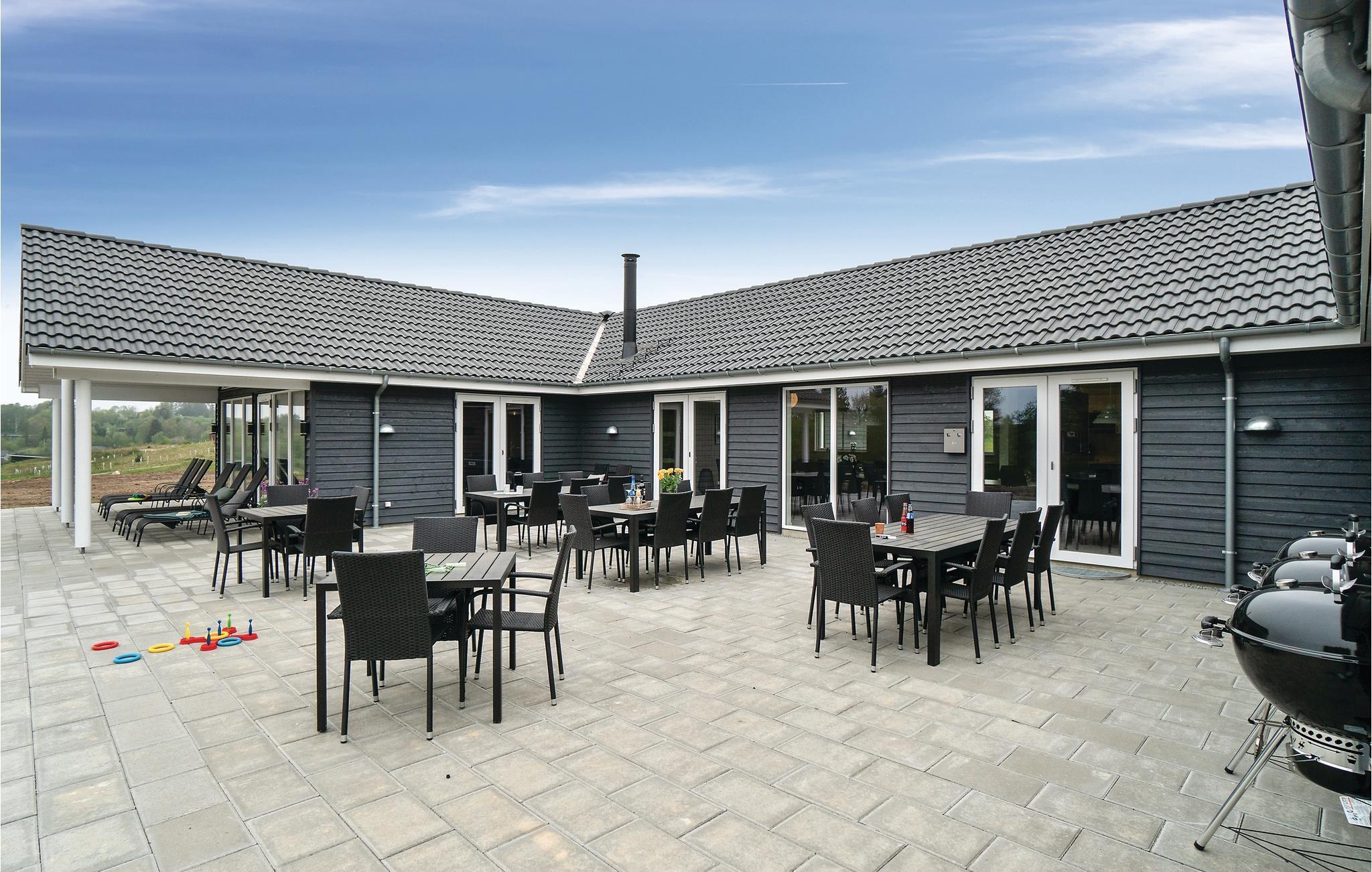 3,7Das schöne Ferienhaus für 18 Personen enthält 7 Schlafzimmer, die sich auf zwei Hausteile verteilen. Vier Schlafgelegenheiten befinden sich auf dem Schlafboden. Es sind drei Badezimmer, eine große Küche und ein helles Wohnzimmer vorhanden. Auch Spielzimmer