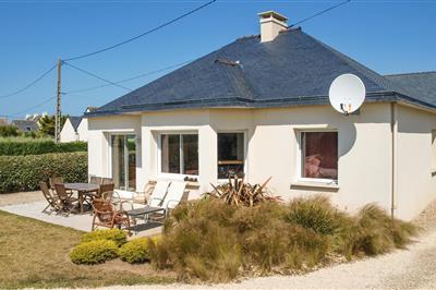 4,4"Ty Fañch", 3-Zimmer-Haus 70 m2. Zweckmässig und gemütlich eingerichtet: Wohn-/Esszimmer mit Esstisch, Sat-TV und Stereoanlage. Ausgang zur Terrasse. 2 Zimmer, jedes Zimmer mit 1 franz. Bett (160 cm). Offene Küche (1 Kochplatte, Backofen, Geschirrspüler, 3