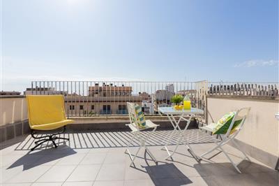 4,3"Lluis", 3-Zimmer-Wohnung 62 m2 im 5. Stock. Geräumig, komfortabel und schön eingerichtet: Wohn-/Esszimmer mit Digital-TV, Flachbildschirm, Klimaanlage und Warmluftheizung. Ausgang zum Balkon. 1 Zimmer mit 1 franz. Bett (150 cm, Länge 190 cm). 1 Kinderzimmer