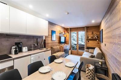4,5"Odalys Essentielle Le Hameau du Mottaret", 2-Zimmer-Wohnung 30 m2. Zweckmässig eingerichtet: Wohn-/Schlafzimmer mit 2 Betten, Esstisch und TV. 1 Zimmer mit 3 Schlafmöglichkeiten. Kochnische (2 Kochplatten, Geschirrspüler, Wasserkocher, Mikrowelle,