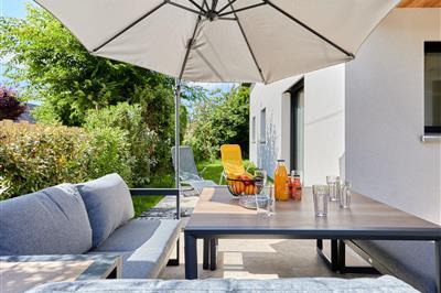 4,2"La Plage", 5-Zimmer-Haus 115 m2 auf 2 Stockwerken. Sehr schön und geschmackvoll eingerichtet: Wohn-/Esszimmer mit TV (Flachbildschirm), E-Heizung und Holzofen. Ausgang zur Terrasse. 1 Zimmer mit 1 franz. Bett (1 x 140 cm, Länge 190 cm). Wohnküche (Backofen,