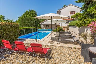 5,0Das moderne Ferienhaus mit Garten befindet sich in der Gegend von Kastav, oberhalb der Riviera von Opatija. Es gibt einen Pool für eine Erfrischung an heißen Sommertagen und eine Terrassen mit Grill zum Entspannen. Im Keller können Sie Ihre Fähigkeiten beim