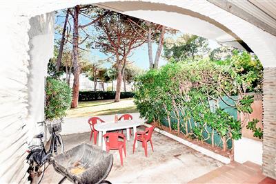 4,7"Les Pins Parasols", 3-Zimmer-Wohnung 60 m2, im Erdgeschoss. Hell, modern eingerichtet: Wohn-/Esszimmer mit Esstisch, Sat-TV und elektrischem Rollladen. Ausgang zur Terrasse, Richtung Süden. 1 Zimmer mit 1 franz. Bett (160 cm), elektrischem Rollladen. Ausgang
