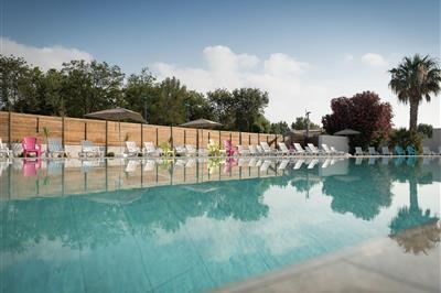 4,0"Le Mediterranée", 3-Zimmer-Mobilheim 35 m2. Komfortabel eingerichtet: Wohn-/Esszimmer mit Esstisch und Sat-TV (Flachbildschirm). Ausgang zur Terrasse. 1 Zimmer mit 1 franz. Bett (160 cm, Länge 200 cm), sep. WC und Dusche. 1 Zimmer mit 2 Betten (80 cm, Länge