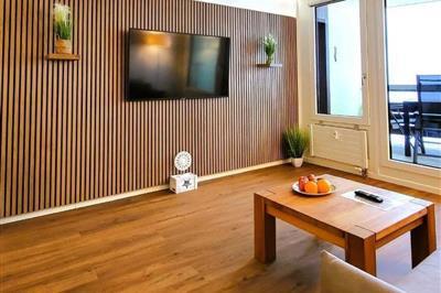 4,9"Enzian 720", 4-Zimmer-Maisonette-Wohnung 140 m2 auf 2 Stockwerken, im Obergeschoss. Geräumig und hell, sehr komfortabel und geschmackvoll eingerichtet: offenes grosses Wohn-/Esszimmer mit Panoramafenster mit Esstisch und Kabel-TV. Ausgang zum Balkon. 1