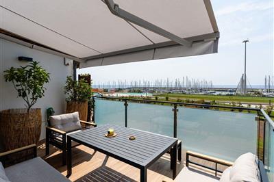 4,0"Entre Bateau et Mer", 2-Zimmer-Wohnung 60 m2 im 1. Stock. Sehr modern und geschmackvoll eingerichtet: Wohn-/Esszimmer mit 1 Diwanbett (140 cm, Länge 200 cm), TV. Ausgang zur Terrasse. 1 Doppelzimmer. Kochnische (Backofen, 4 Induktionskochplatten, Toaster,