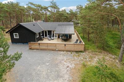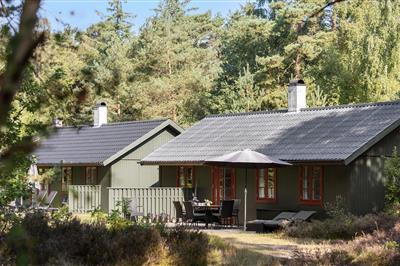 Dieses schöne Ferienhaus liegt ungestört auf einem großen Naturgrundstück mit Kiefern und Heidekraut – hier gibt es gute Spielmöglichkeiten für die Kinder. Das Haus verfügt über schöne, abgeschirmte und vor dem Wind geschützte Terrassenbereiche. Das Haus ist