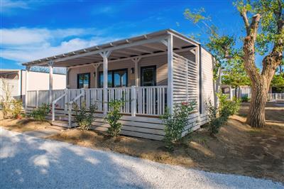 "Ambra", 3-Zimmer-Mobilheim 34 m2. Objekt geeignet für 4 Erwachsene + 1 Kind. Modern eingerichtet: Wohn-/Esszimmer mit Sat-TV, Klimaanlage und Warmluftheizung. Ausgang zur Veranda. 1 Doppelzimmer mit Dusche/Bidet/WC. Ausgang zur Veranda. 1 Zimmer mit 2 Betten