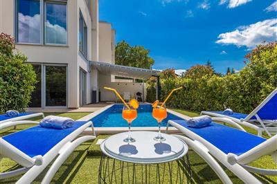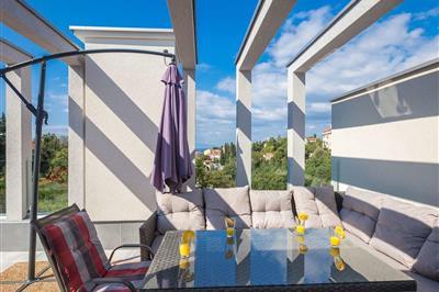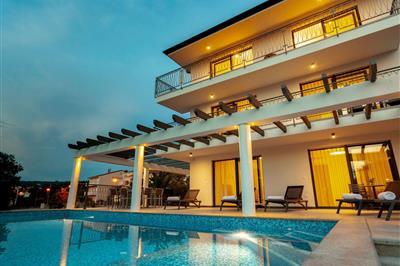 5,0Im Ort Malinska, auf der Insel Krk, steht dieses moderne Ferienhaus. Im Erdgeschoss erwartet Sie ein geräumiger Wohnraum mit angrenzender Küche. Direkt von diesem Bereich geht es in den Garten und der Sonnenterrasse mit Außenpool. Im ersten Stock finden Sie