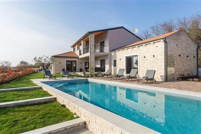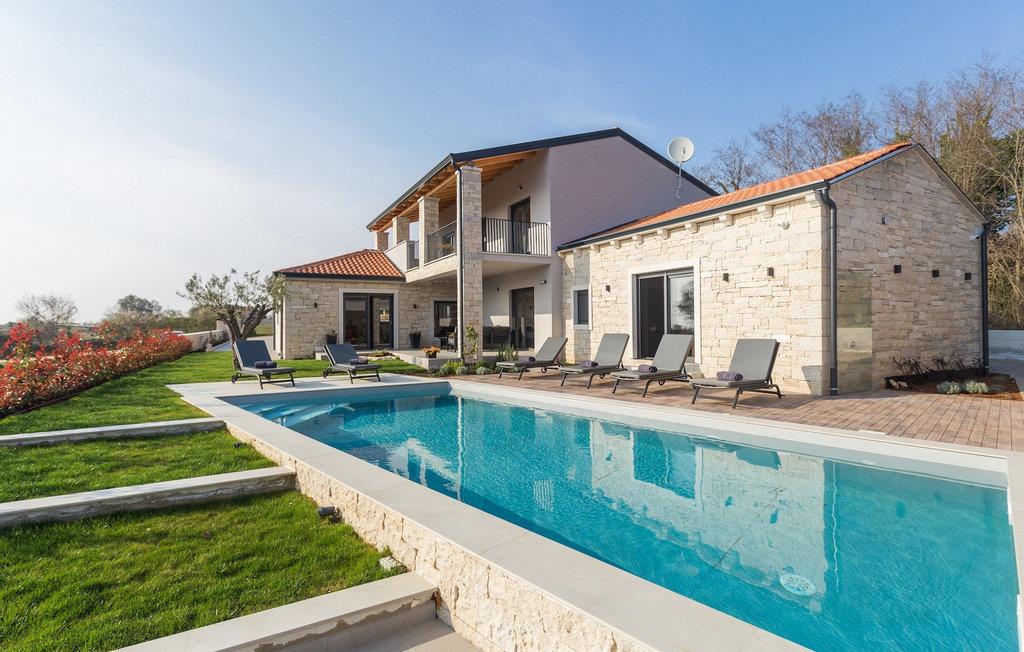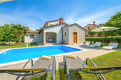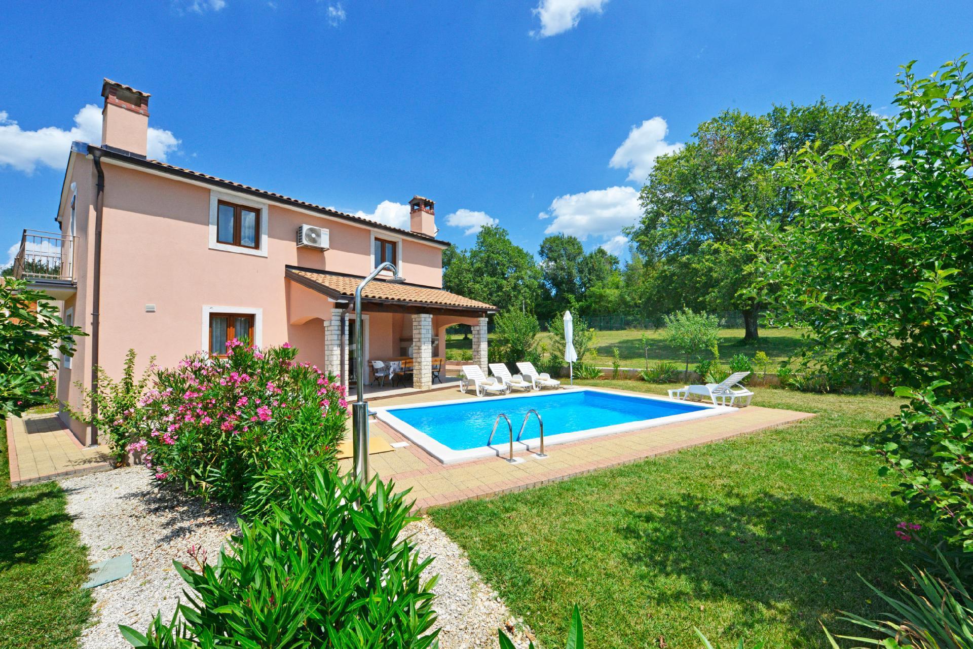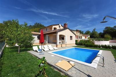 4,0Dieses Ferienhaus mit Swimmingpool liegt im kleinen Dorf Kmacici, in der Nähe von Tinjan, einer Ortschaft im Landesinneren. Das Haus ist geschmackvoll und zeitgemäß eingerichtet. Im Erdgeschoss befinden sich ein großes Wohnzimmer, Küche und Esszimmer. Über