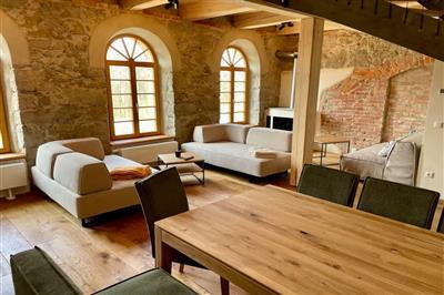 Unterkunft mit Kamin, Whirlpool und Sauna Haus: Diese außergewöhnliche Ferienwohnung bietet auf zwei Ebenen luxuriösen Wohnkomfort und viel Platz für Familien oder kleine Gruppen. Im Erdgeschoss erwartet Sie eine großzügige, komplett ausgestattete Küche mit