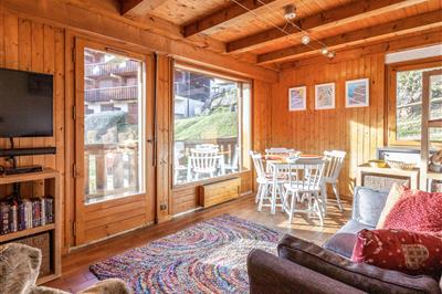 4,0"L'Adret", 6-Zimmer-Haus 300 m2. Objekt geeignet für 6 Erwachsene + 8 Kinder. Vollständig renoviert im Jahre 2021, komfortabel und modern eingerichtet: Wohn-/Esszimmer mit offenem Kamin (nur Deko), TV (Flachbildschirm). Ausgang zum Balkon. 1 Zimmer mit 1