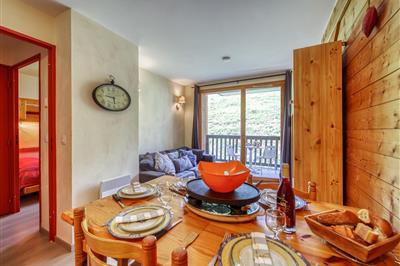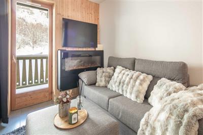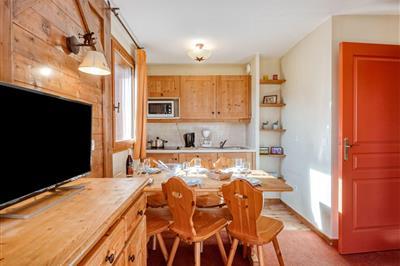 4,0"Les Chalets du Galibier", 2-Zimmer-Wohnung 40 m2. Objekt geeignet für 5 Erwachsene. Gemütlich und mit viel Holz eingerichtet: Wohn-/Schlafzimmer mit 2 Schlafmöglichkeiten und TV. 1 Zimmer mit 2 Betten. Kabine mit 1 x 2 Etagenbetten. Kochnische