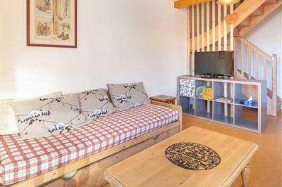 4,0"Odalys Référence Le Grand Panorama 1", 3-Zimmer-Reihenhaus 45 m2 auf 2 Stockwerken. Rustikal eingerichtet: 1 Zimmer mit 1 franz. Bett (140 cm, Länge 190 cm). 1 Zimmer mit 2 Schlafmöglichkeiten. Sep. WC, Bad oder Dusche. Obergeschoss: Wohn-/Schlafzimmer mit 1