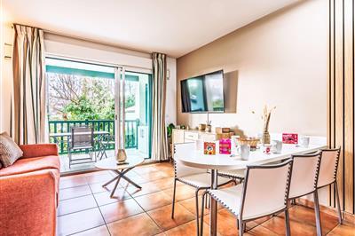 4,1"Domaine Iratzia", 3-Zimmer-Wohnung 45 m2 im 1. Stock. Komfortabel und schön eingerichtet: Wohn-/Esszimmer mit 1 Doppeldiwanbett (140 cm, Länge 190 cm), TV (Flachbildschirm). Ausgang zur Terrasse. 1 Zimmer mit 1 franz. Bett (1 x 160 cm, Länge 200 cm). Ausgang