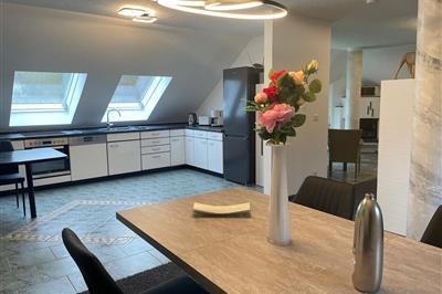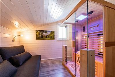 5,0"Naturnah mit Pool und Sauna", 4-Zimmer-Haus im Obergeschoss. Geräumig und hell, sehr modern und gemütlich eingerichtet: offenes grosses Wohn-/Esszimmer mit Sat-TV. Ausgang zum Balkon. 1 grosses Zimmer mit 1 Doppelbett (1 x 180 cm, Länge 200 cm). 1 grosses