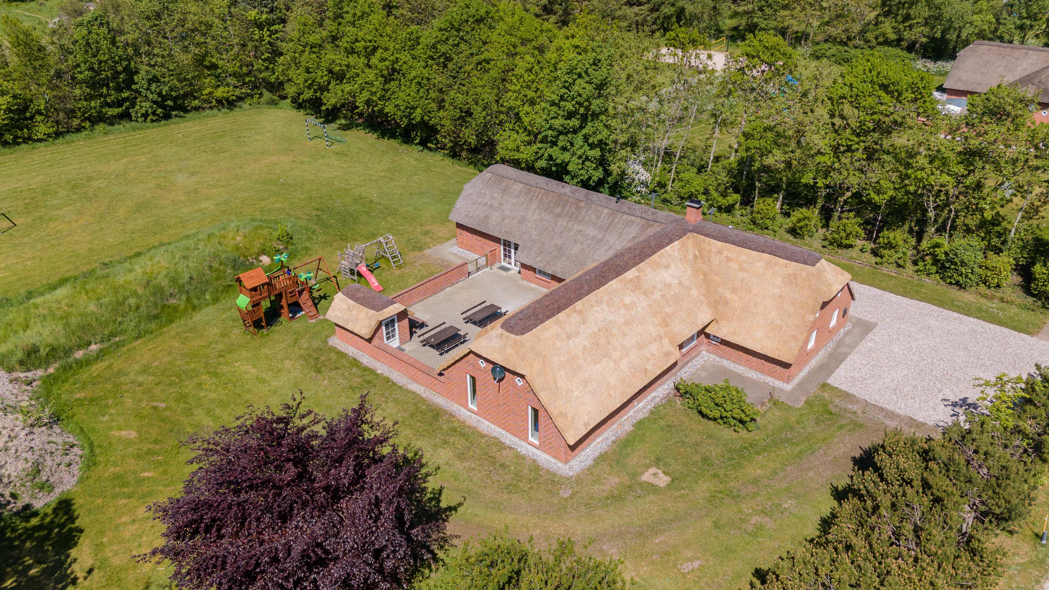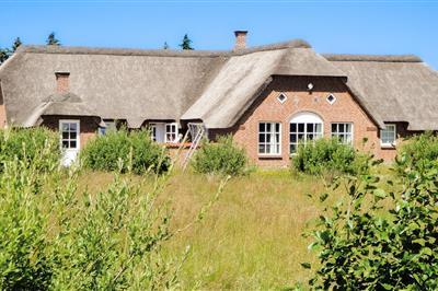 4,3Auf einem großen Grundstück in einem alten Dünen- und Plantagengebiet zwischen Søndervig und Thorsminde liegt ein für die Umgebung typisches, rustikales, reetgedecktes Luxushaus mit Pool. Im Haus gibt es sechs Schlafzimmer, drei Badezimmer und eine gemütliche
