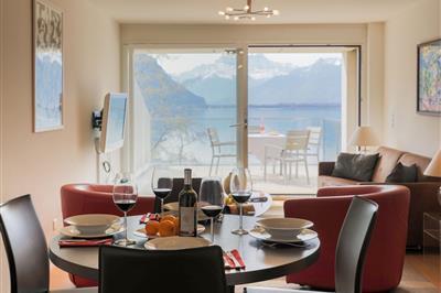4,0"L'Esplanade A1.4", 5-Zimmer-Wohnung 214 m2 im 1. Stock. Luxuriös und geschmackvoll eingerichtet: grosses Wohn-/Esszimmer mit offenem Kamin (nur Deko), Kabel-TV, DVD, G-Heizung, Klimaanlage und elektrischem Rollladen. Ausgang zur Terrasse. 1 grosses Zimmer