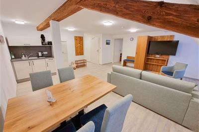 Suite 6 im Obergeschoss ohne Balkon/Terrasse Die Suite Schwarzstorch ist eine 2022 renovierte, allergikerfreundliche 5-Sterne-Unterkunft im Parterre mit 59 m² für bis zu 4 Personen. Sie bietet 1 Schlafzimmer, ein Wohnzimmer mit offener Küche, bodengleiche