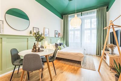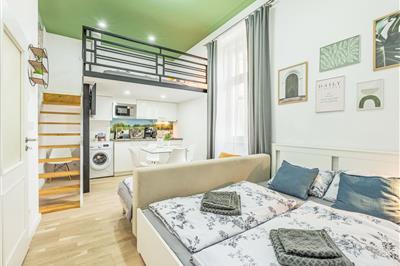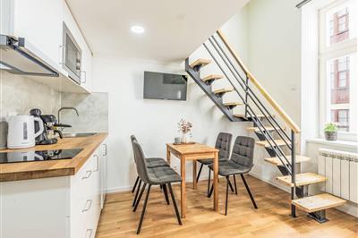4,72-Zimmer-Wohnung 30 m2 im 3. Stock. Hell, vollständig renoviert, sehr schön und modern eingerichtet: Eingang. Wohn-/Esszimmer mit 1 Doppeldiwanbett (150 cm, Länge 200 cm), Esstisch und TV. Kochnische (2 Induktionskochplatten, Toaster, Wasserkocher,
