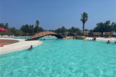 2,8"Happy Superior", 4-Zimmer-Mobilheim 32 m2. Komfortabel eingerichtet: Wohn-/Esszimmer mit E-Heizung und Klimaanlage. 1 Zimmer mit 1 franz. Bett (140 cm, Länge 190 cm), Dusche/WC. 2 Zimmer, jedes Zimmer mit 2 Betten (70 cm, Länge 190 cm). Offene Küche (4