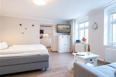 2,0Villa Goodewind * App. 1.2 In dem hellen 2-Raum-Appartement Nr. 1.2 der Villa Goodewind können bis zu vier Personen erholsame Urlaubstage auf 40 Quadratmetern verbringen. Der Wohnraum ist mit einer bequemen Sitzgarnitur und Flat TV ausgestattet, sodass Sie