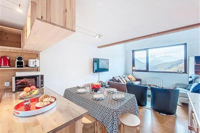 3,2"LA COMBE AUX OURS", 4-Zimmer-Wohnung 90 m2 auf 3 Stockwerken im 1. Stock, Südostlage. Komfortabel eingerichtet: Wohn-/Esszimmer mit TV (Flachbildschirm). Ausgang zum Balkon. Wohnküche (Backofen, Geschirrspüler, 4 Glaskeramikplatten, Toaster, Wasserkocher,