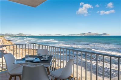 4,4Castello Platja - Apartment In Can Picafort Haus: Der kleine, möblierte Balkon verwandelt sich, durch den wundervollen Ausblick, in einen magischen Ort, während Sie einen Kaffee oder ein Glas Wein trinken, Lesen und Entspannen und dabei auf das Meer