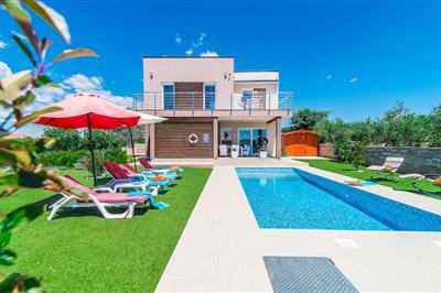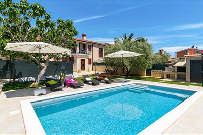 Die schöne Villa Campagna trägt Ihren Namen mit Recht. Diese luxuriöse Villa befindet sich in dem kleinen Dorf Galizana in der Nähe der Stadt Pula und ist eine wunderschöne Mischung aus modernem und traditionellem Stil eingerichtet, umgeben von einer