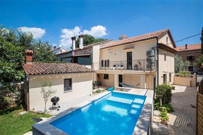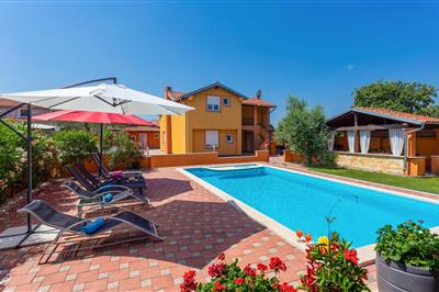 4,5Istrienurlaub mit Freunden und Haustier. Dieses schöne Ferienhaus mit Pool befindet sich in einer ruhigen Umgebung in dem kleinen Ort Škicini. Das Grundstück ist eingezäunt mit einem schönen und gepflegten Garten, der mit vielen Blumen und Pflanzen