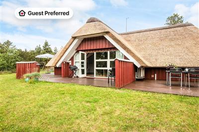 4,5Dieses Ferienhaus aus Holz mit Reetdach, 1987 gebaut und 2023 letztens modernisiert, liegt auf einem großen, mit Heidekraut bewachsenen Naturgrundstück im schönen Gebiet, Kongsmark. Zum Haus gehören 2 große, offene, nach Süden und Westen gerichtete Terrassen