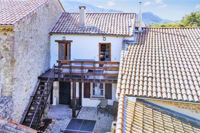 Verbringen Sie ruhige Urlaubstage in diesem schlichten Steinhaus mit Poolzugang und Blick auf die Berge. Richten Sie sich in den Innenräumen ein, die durch Holzbalken und einen Kaminofen eine gemütliche Atmosphäre schaffen. Nutzen Sie den Essbereich für