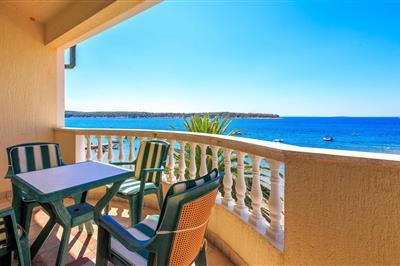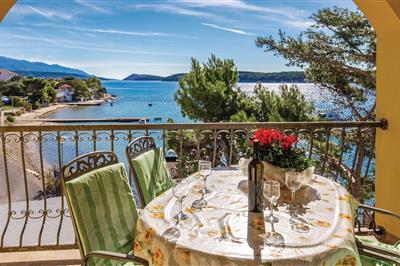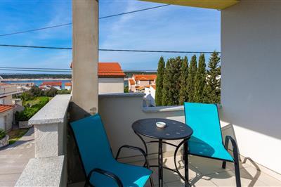 Genießen Sie die wunderschöne Aussicht auf das Meer und die Stadt Rab aus dieser geschmackvoll eingerichteten Ferienwohnung, die sich im zweiten Stock befindet (wie auch CKR507). Von der überdachten Terrasse mit Gartenmöbeln überblicken Sie ebenfalls das Meer
