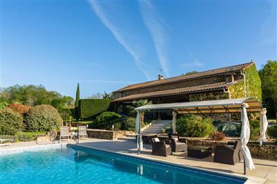 4,4Dordogne Familienparadies Haus: Dieses stilvolle Ferienhaus für 6 Personen liegt im ruhigen Dörfchen Mas de Mouly in der Nähe von Prats-du-Périgord und bietet einen erholsamen Rückzugsort auf dem Land mit privatem Pool, überdachter Terrasse und Garten mit