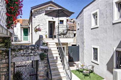 Genießen Sie mediterrane Gemütlichkeit im Herzen von Turanj. Dieses stilvolle und gemütliche Reihenhaus auf zwei Etagen vereint den Charme eines klassischen Steinhauses mit moderner Einrichtung. Die zwei separaten Wohneinheiten sind durch eine Außentreppe