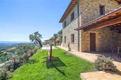 Genießen Sie in diesem Ferienhaus den Blick auf die Hügel Umbriens. Dieses fantastische, komplett modernisierte Steinhaus mit seinen typisch italienischen Holzdecken und dekorativen Balken, das direkt an einen Hügel gebaut wurde, ist faszinierend an sich.