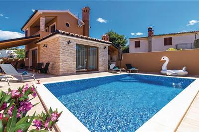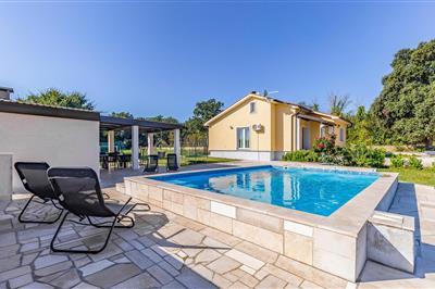 4,0Das neugebaute Ferienhaus mit Pool befindet sich in Valtura, einem Ort etwa 10 Kilometer von Pula entfernt. Das Haus erstreckt sich über zwei Etagen. Im Erdgeschoss liegen die Küche, der Wohnbereich mit Esszimmer, zwei Schlafzimmer sowie das Badezimmer und