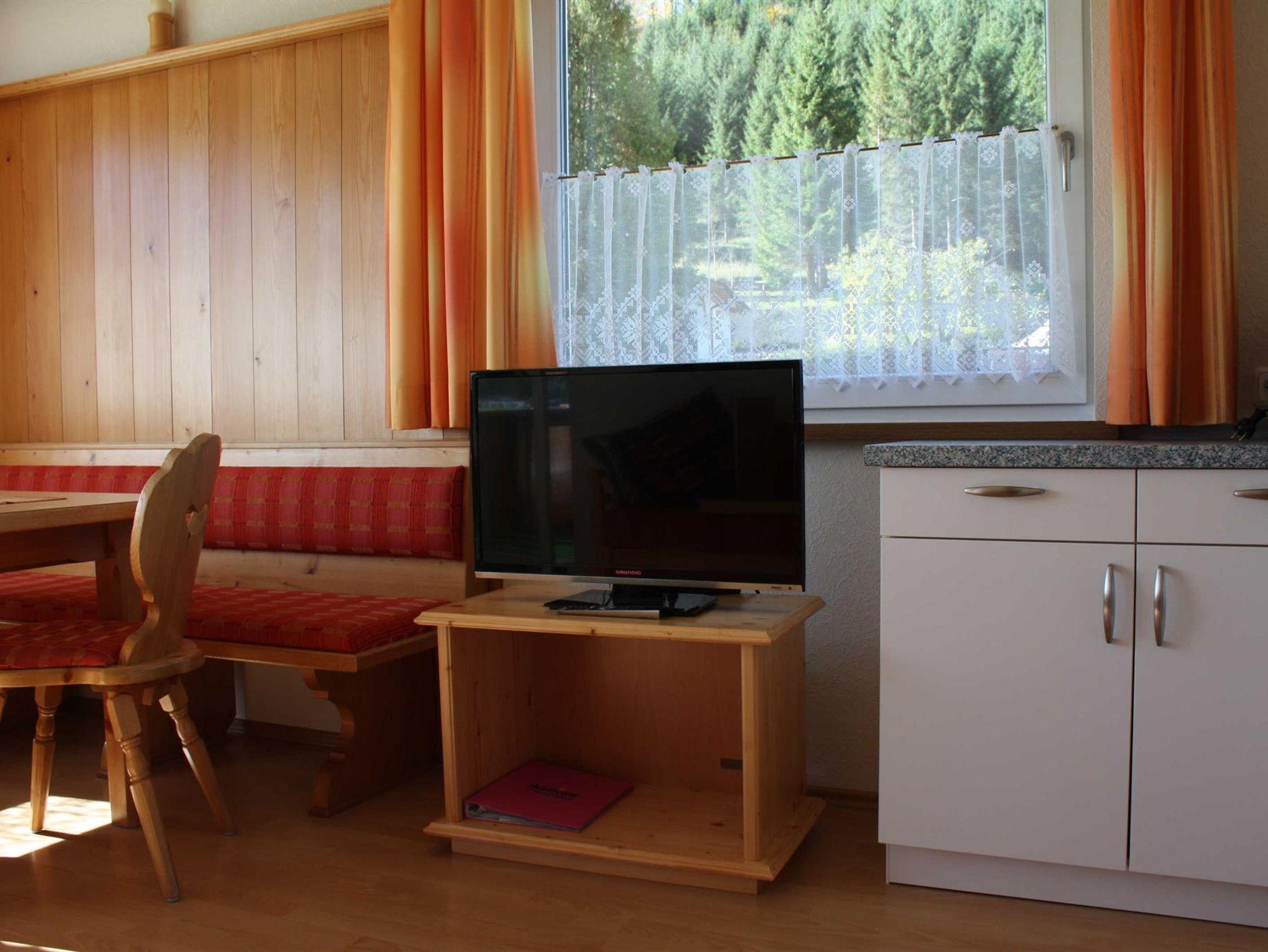 65 m² Wohnung mit einem freien Ausblick über die Wiesen und der Bergwelt. Am Waldrand gelegen ein idealer Ausgangspunkt für Wanderungen und Spaziergänge sowie zum Langlaufen. Die im 1. Stock gelegene Ferienwohnung ist im ländlichen Stil eingerichtet und hat 1 Schlafzimmer mit einem Ehebett und ein weiteres mit 3 Einzelbetten, daher gut für Familien geeignet. Die Wohnküche ist nach Süden und Westen ausgerichtet mit Zugang zum Balkon. Ausgestattet mit Eckbank und Tisch sowie eine Couch mit Beistelltisch zum Fernsehen (Sat-TV). In der Küche ist ein Herd mit Backofen, Kühlschrank mit Gefrierfach, Kaffeeautomat, Wasserkocher, Toaster und Eierkocher. W-Lan ist kostenfrei. Im Parterre ist eine Garderobe vorhanden.