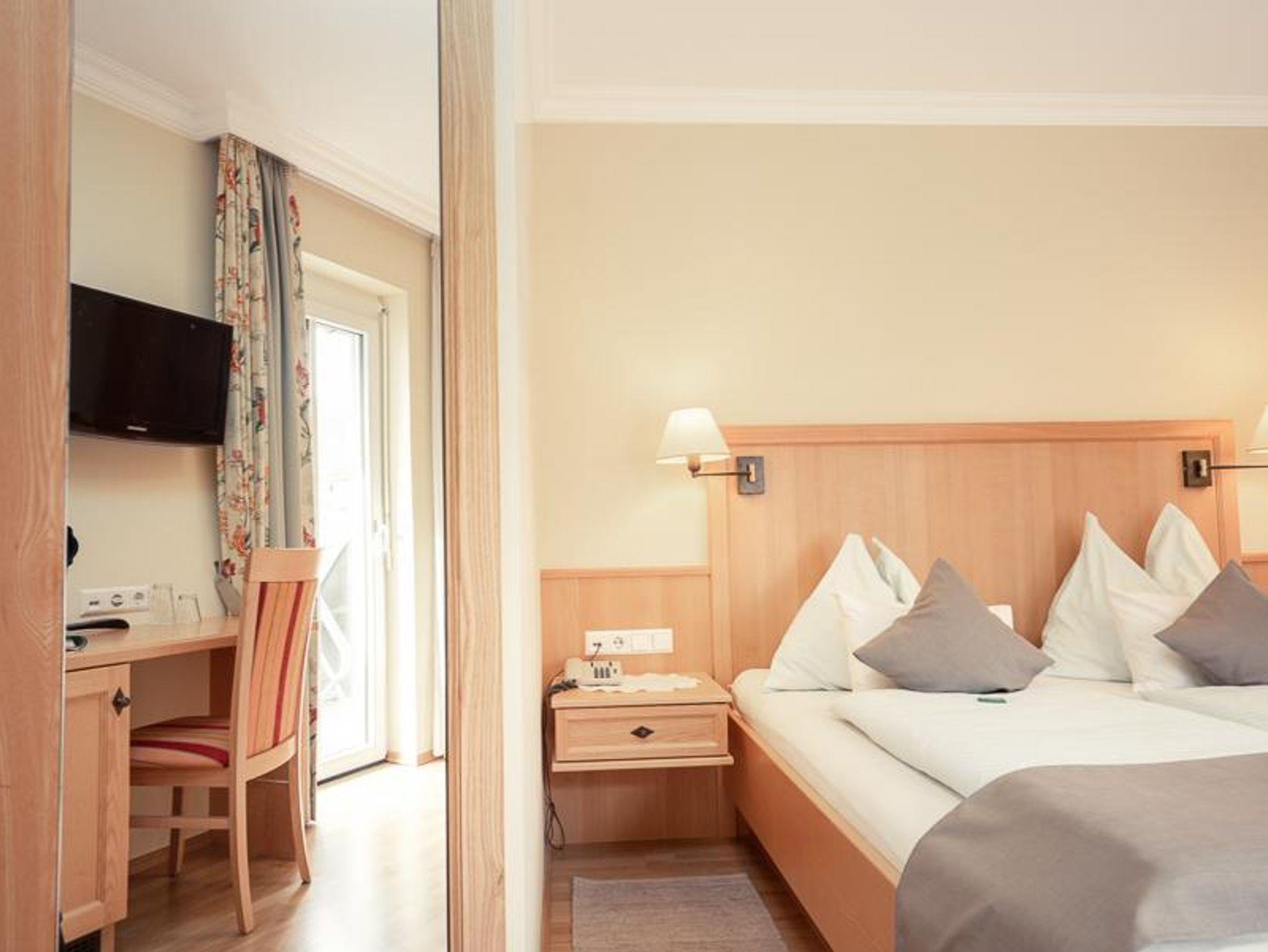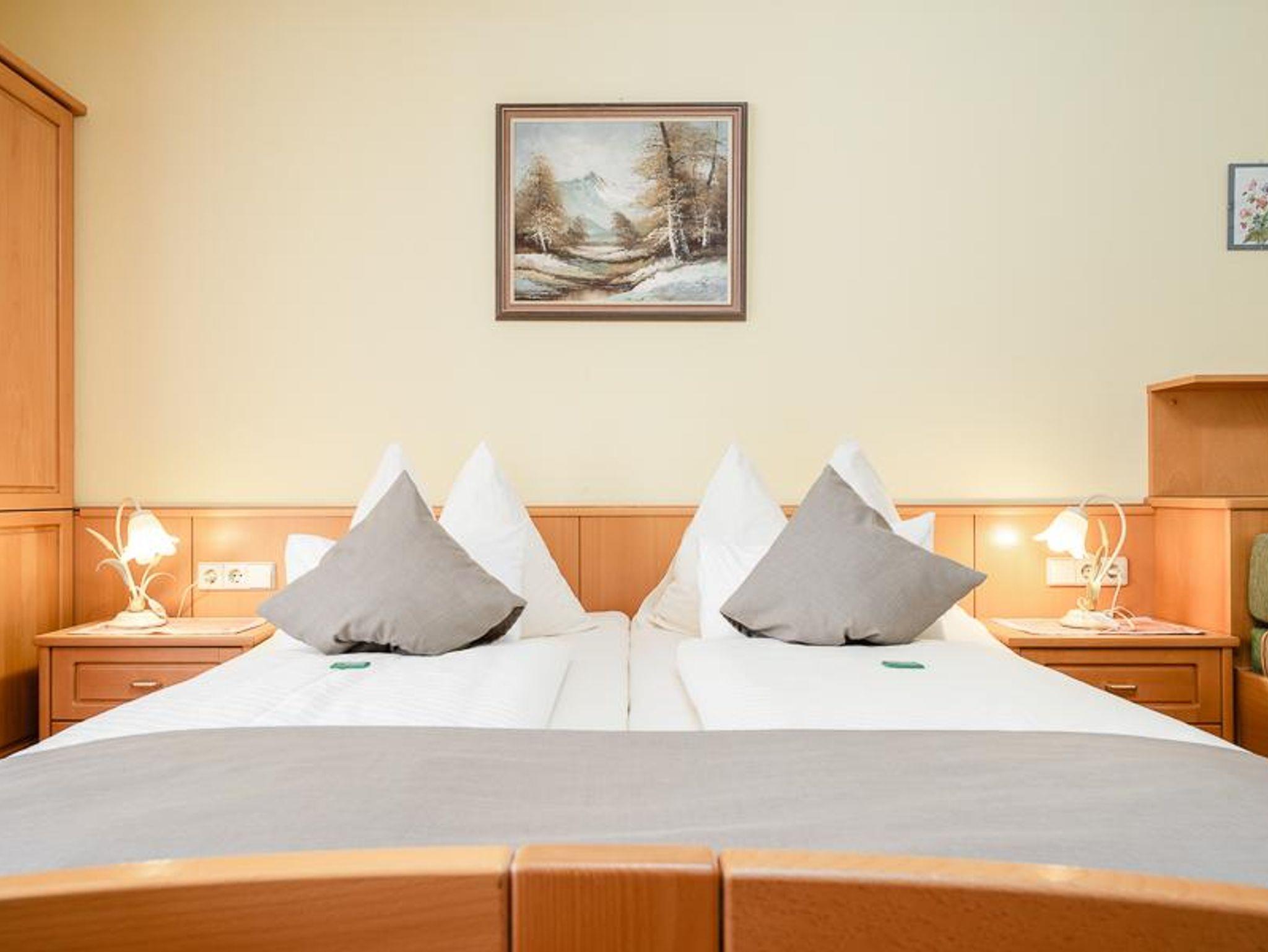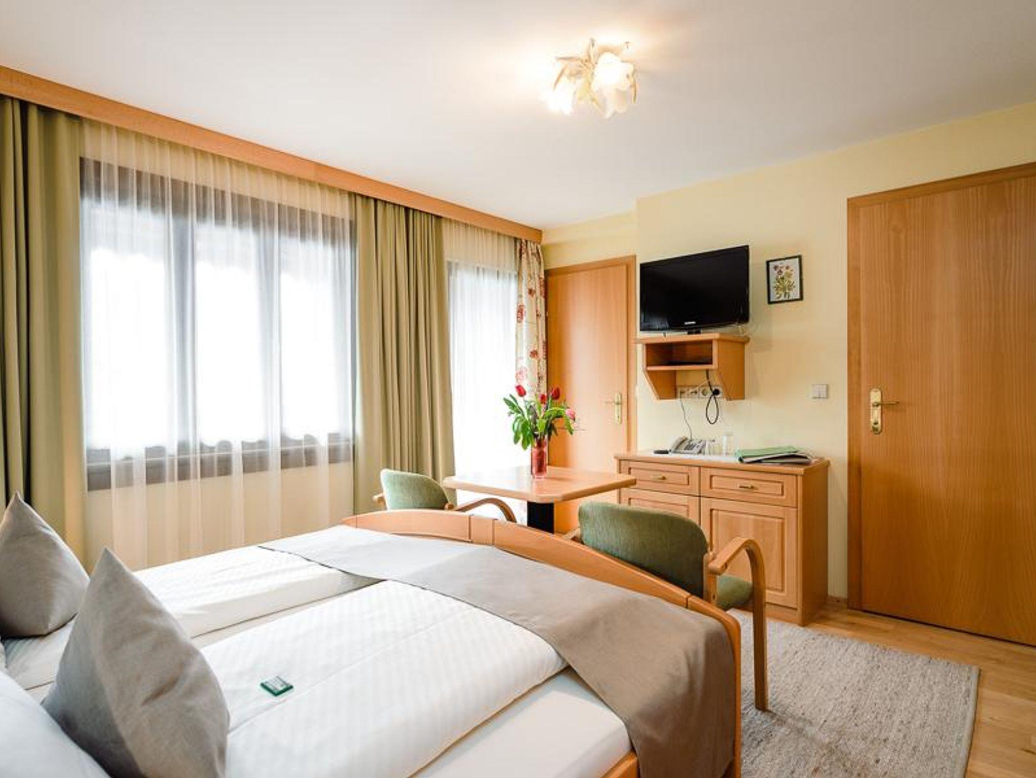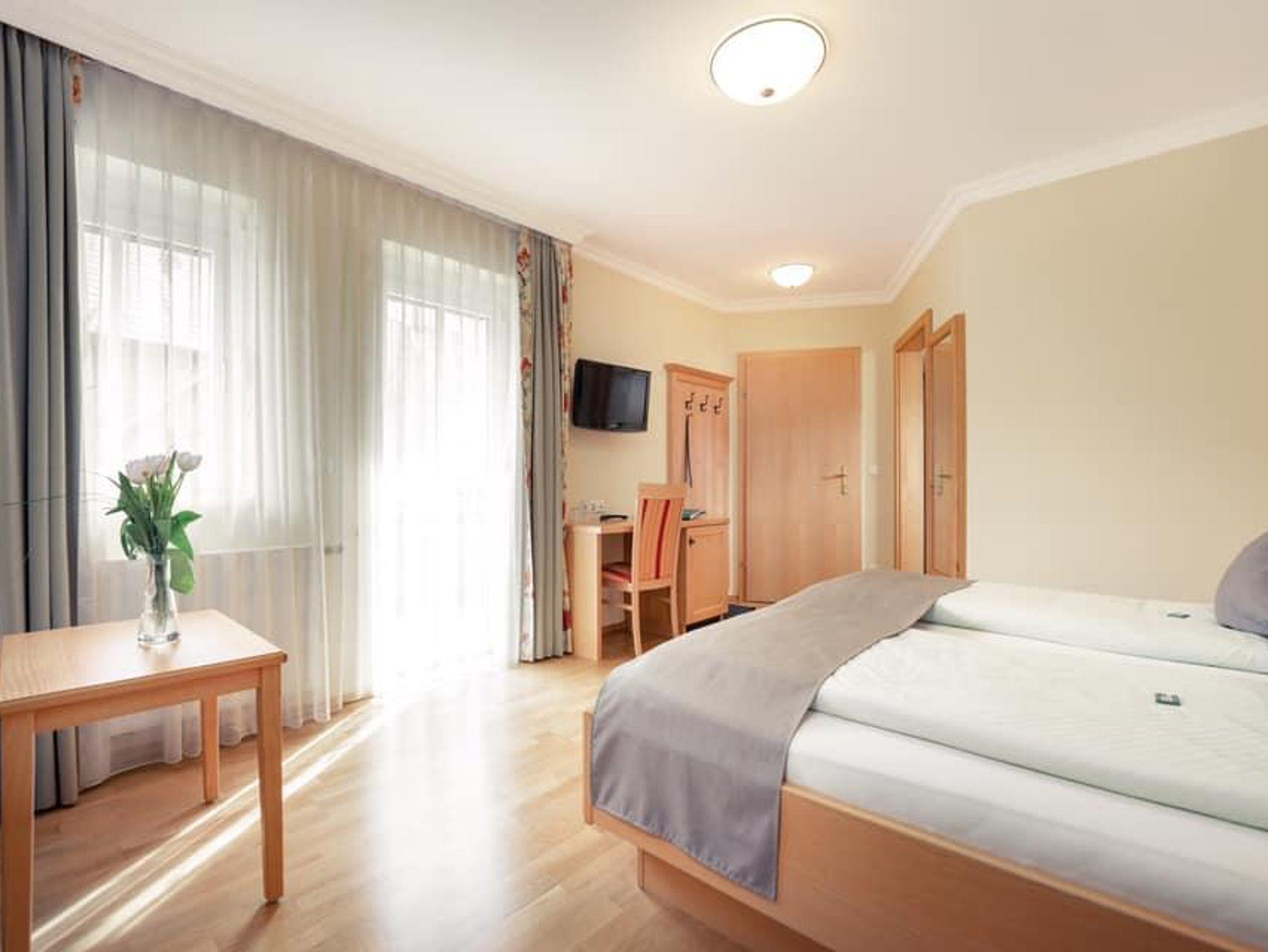 Doppelzimmer mit DU/WC, teilweise mit Balkon, davon 1 Dreibettzimmer. Die Zimmer sind ausgestattet mit Telefon, Fernseher, Radio, W-LAN, Sessel und Schreibtisch, Badezimmer mit Handtücher, Haarfön, Abstellmöglichkeiten.