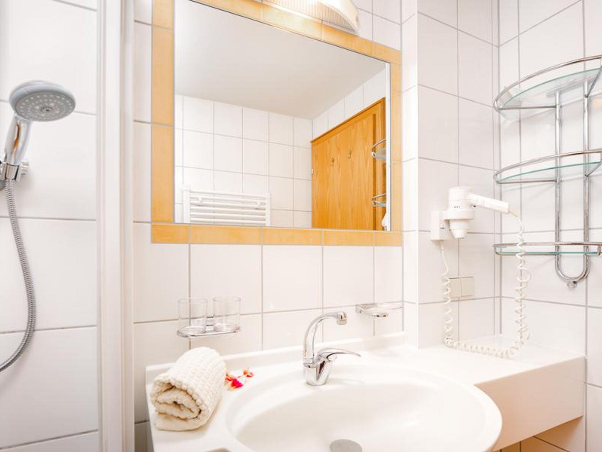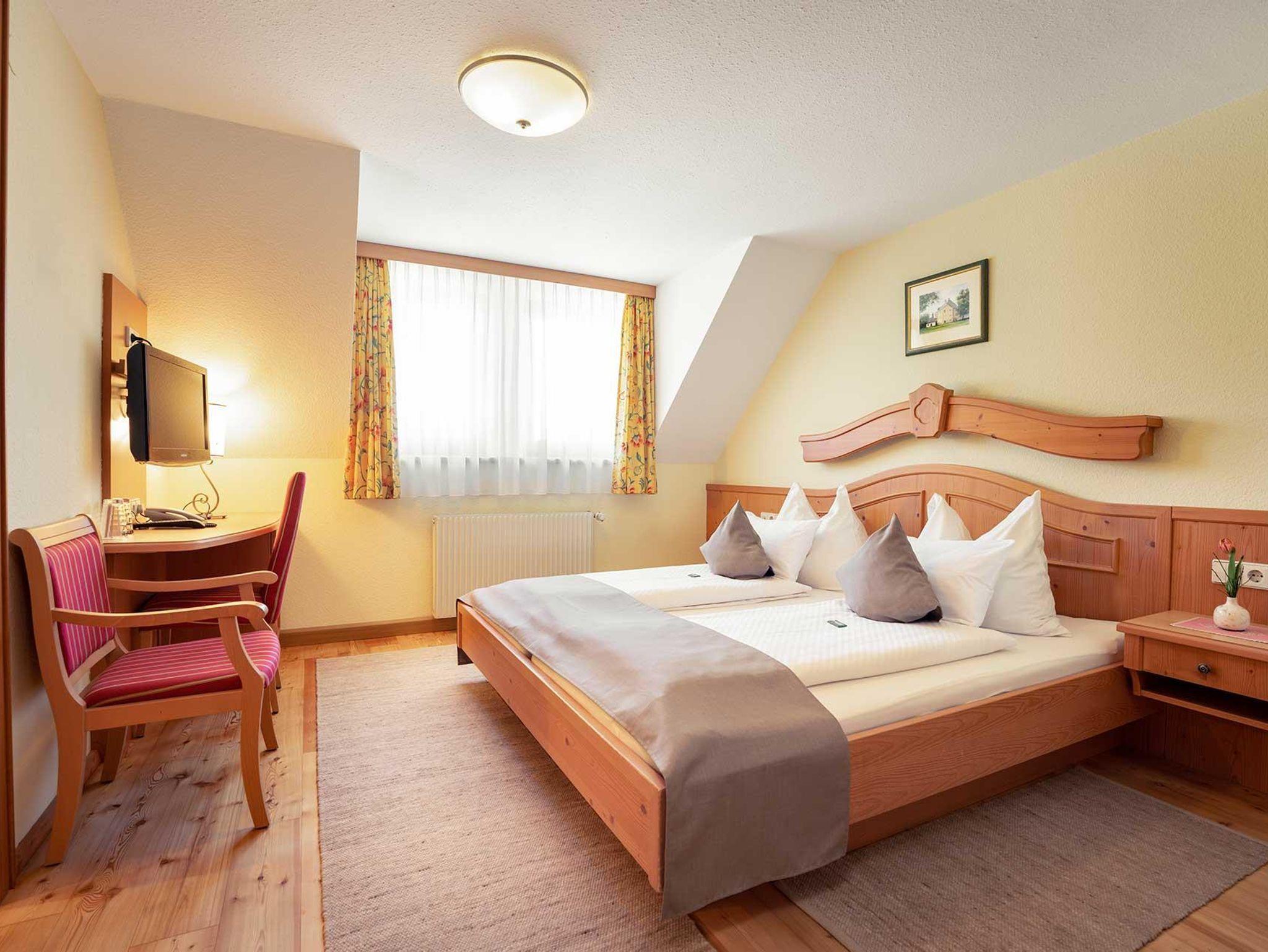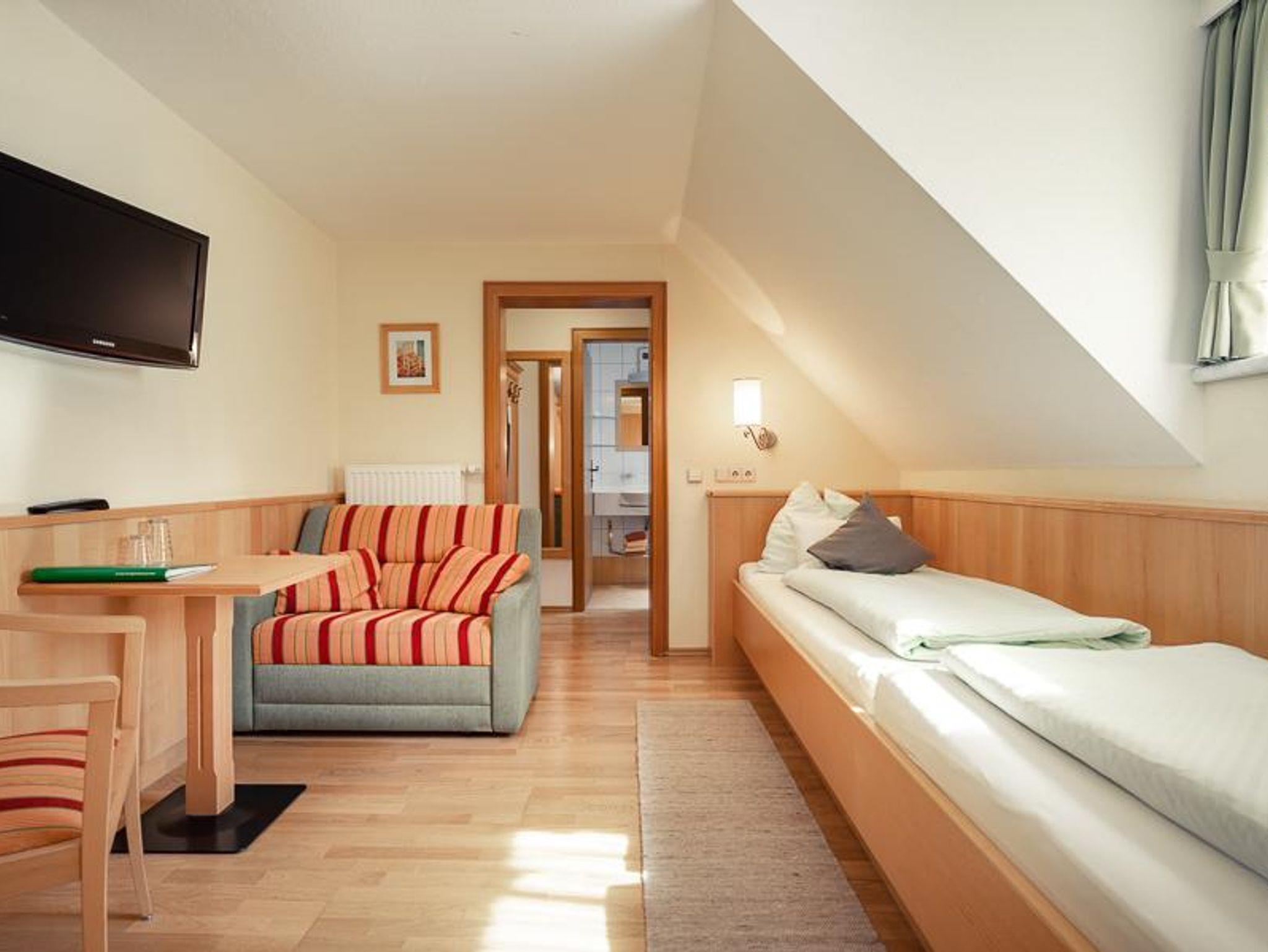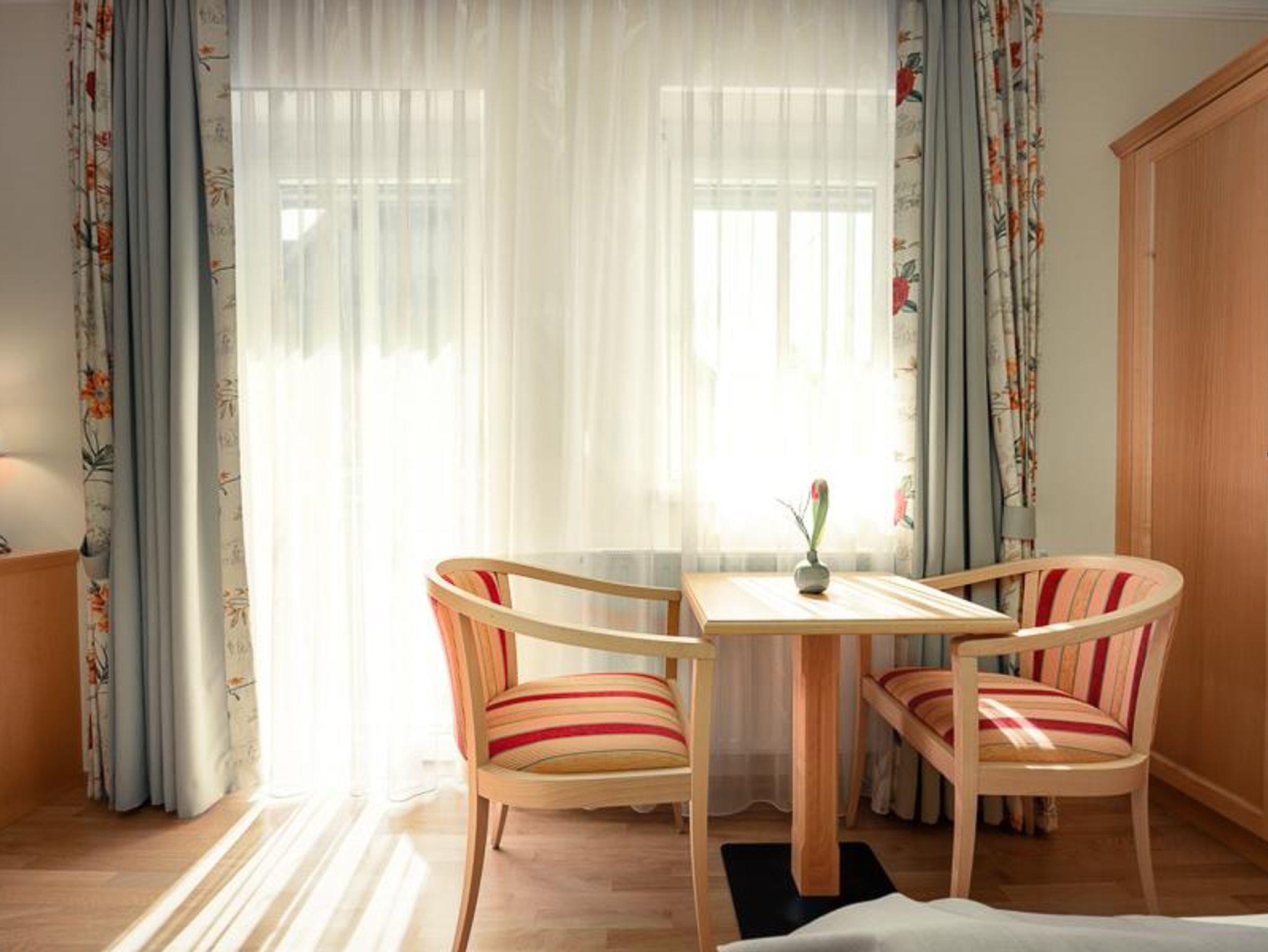Doppelzimmer mit DU/WC, teilweise mit Balkon, davon 1 Dreibettzimmer. Die Zimmer sind ausgestattet mit Telefon, Fernseher, Radio, W-LAN, Sessel und Schreibtisch, Badezimmer mit Handtücher, Haarfön, Abstellmöglichkeiten.