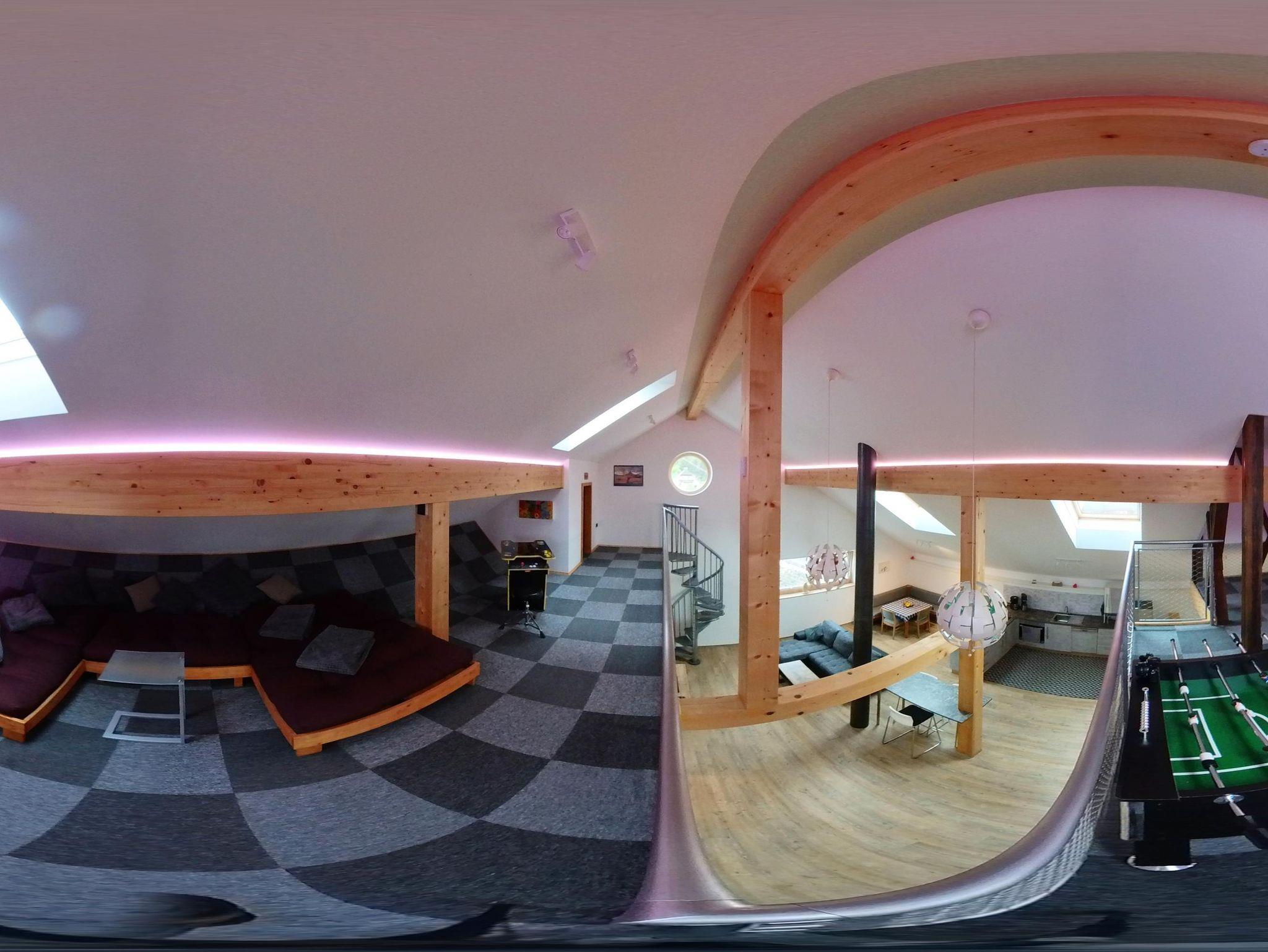 Im Wohnbereich haben Sie eine offene Küche – voll ausgestattet – Küchentisch mit Eckbank, sowie einem Sofa – natürlich finden Sie auch hier einen Flat TV. Ebenfalls gibt es einen kleinen Stehtisch, der als Arbeitsplatz genutzt werden kann. Das Badezimmer verfügt über eine ebenerdige Dusche, WC und 2 Waschbecken, sowie genügend Ablageflächen. Auf der Galerie finden Sie eine Dartscheibe, ein Pac-Man Videoautomat und einen Fußballkasten und auch eine Sitzmöglichkeit.