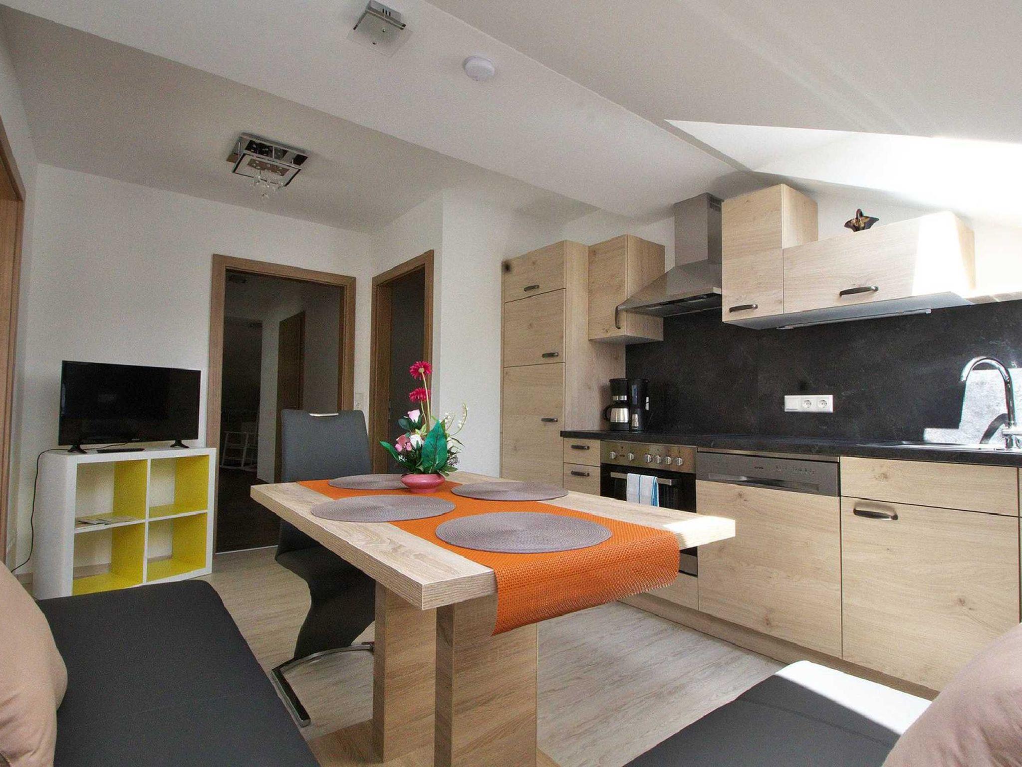 Das Apartment ist 70m² groß und befindet sich im 1. Stock über dem Erdgeschoß und bietet Platz für 1-4 Personen. und ist mit einer Außenstiege durch einen eigenen Eingang zu erreichen. Die Wohnküche ist komplett eingerichtet und mit einem Ceranofen, Kühlschrank und Gefrierfach ausgestattet. Eine gemütliche Sitzecke und ein Fernseher laden zum Wohlfühlen und entspannen ein. Alle Zimmer und Nebenräume sind mit einer Fußbodenheizung ausgestattet. Bettwäsche, Bade- , Hand- und Geschirrtücher sind im Preis inkludiert.